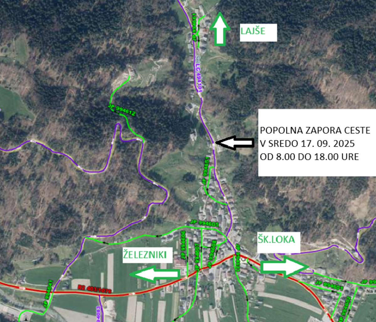 Občina Železniki obvešča, da bo zaradi sanacije povirja in usada vzpostavljena popolna zapora ceste LC 494101 Selca – Lajše v km 0,486 (najbližja hišna številka Selca 42a) dne 17. 9. 2025, od 8.00 do 18.00 ure.