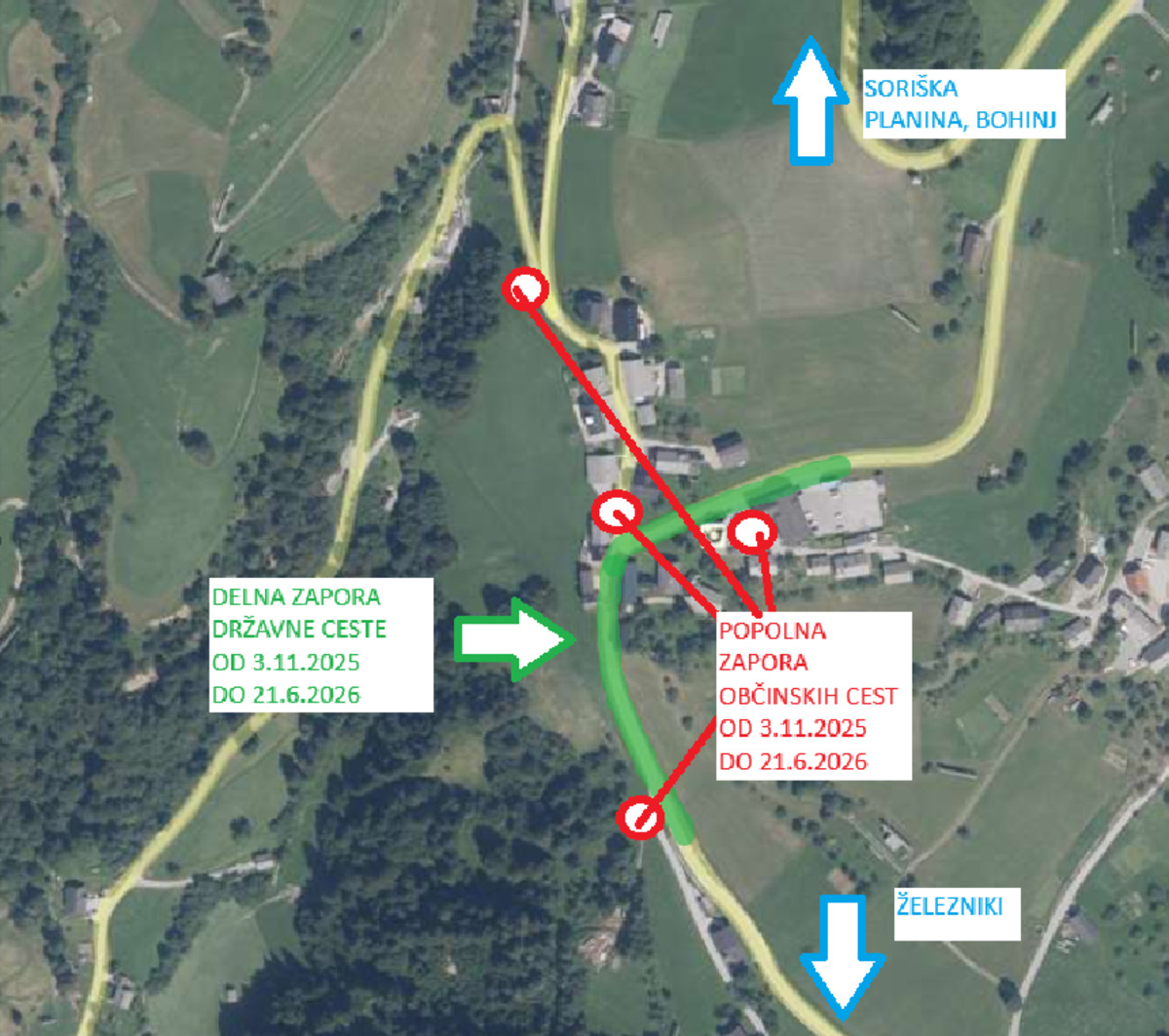 Gorenjska gradbena družba d.d. obvešča, da se bo izvedla obnova odseka državne ceste RT-910/1130 Sorica-Podrošt, od km 1,360 do km 1,625, skozi naselje Sorica. Gradbena dela se bodo izvajala z vzpostavitvijo delnih zapor z izmenično enosmernim prometom s semaforskim urejanjem in občasno kratkotrajno (30 min) popolno zaporo brez vodenja obvoza. Kratkotrajne zapore bodo vzpostavljene le v primeru izvajanja gradbenih del, ki začasno zahtevajo zaustavitev prometa iz obeh smeri. Po potrebi bo lokalnim prebivalcem omogočen dostop preko zapor.