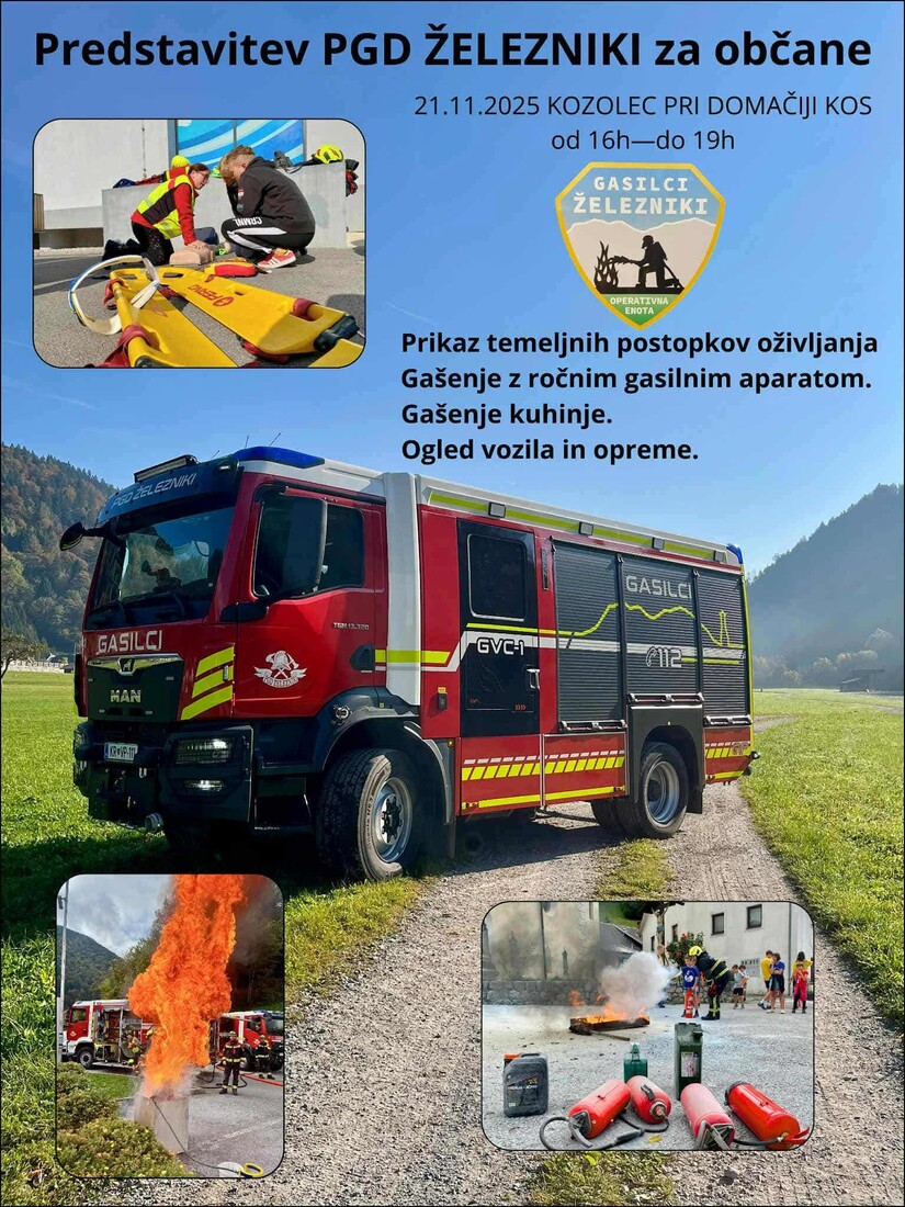Gasilsko društvo Železniki vabi na predstavitev, ki bo v petek, 21. 11. 2025, v Ojstrem Vrhu, pri kozolcu domačije Kos. Prikazali bodo temeljne postopke oživljanja, gašenje z ročnim gasilnim aparatom, gašenje kuhinje ter ogled vozila in opreme.