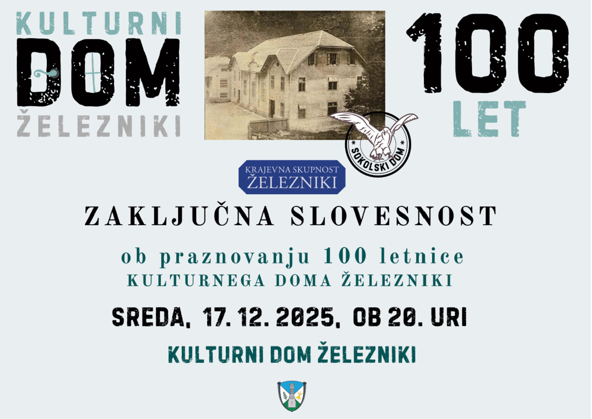 Vabljeni na zaključno slovesnost ob praznovanju 100-letnice Kulturnega doma Železniki, ki bo v sredo, 17. 12. 2025, ob 20.00 uri v Kulturnem domu Železniki.