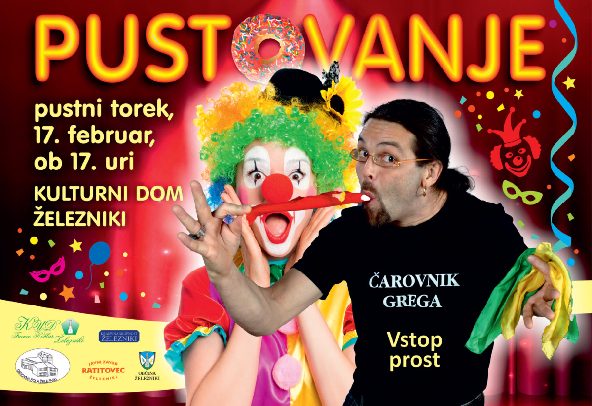 KUD France Koblar Železniki, Občina Železniki, KS Železniki, Javni zavod Ratitovec in OŠ Železniki vabijo v torek, 17. februarja, ob 17. uri, najmlajše maškare v Kulturni dom Železniki na pustno rajanje. Poskrbljeno bo za dobro voljo in pustne krofe.